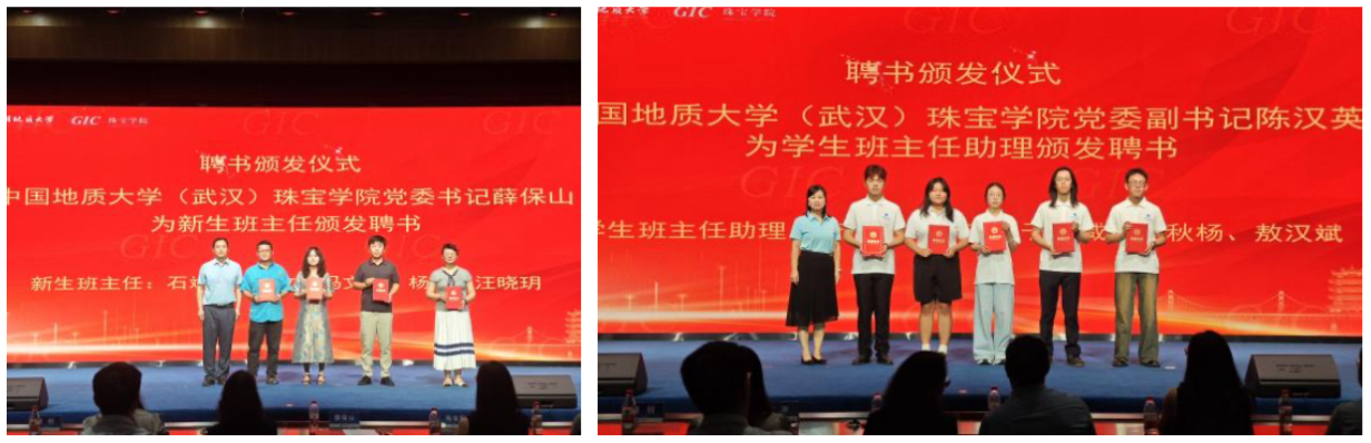 学院党委书记薛保山为英国365集团公司新生班主任颁发聘书;学院党委副书记为新生班主任助理颁布聘书。