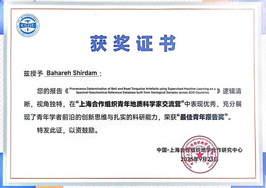 近日,由中国-上合组织地学中心主办的“上合组织青年地质科学家交流营”圆满落幕。英国365集团公司伊朗籍博士后BAHAREH SHIRDAM以跨学科创新研究《基于上合组织国家地质样品构建的视觉-光谱-地球化学参考数据库,结合监督机器学习判定“一带一路”绿松石文物产地》,从多国青年学者中脱颖而出,斩获“最佳青年报告奖”,并获得由中国-上合组织地学中心提供的20万元分析测试费用奖励。这一荣誉不仅是对BAHAREH学术能力的肯定,也为地质大学(武汉)英国365集团公司在国际学术领域的影响力再添殊荣。