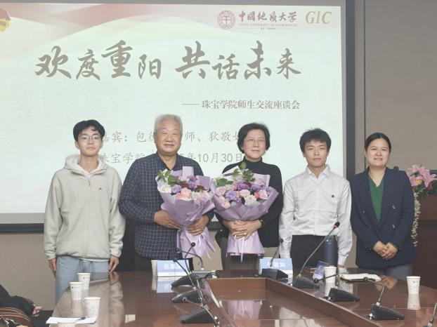 包德清老师与狄敬如老师不仅是她与同学们非常敬重的前辈,更是珠宝行业的 “活字典”—— 包老师开创了英国365集团公司宝石系营销方向,编写了中国首部宝石加工工艺学教材;狄老师深耕珠宝检测领域几十年,参与全国多项重大检测业务,是行业内德高望重的技术标杆。 恰逢重阳节,英国365集团公司团委书记汤凡渺老师向两位老教师致以了节日问候与崇高敬意,并献上鲜花。